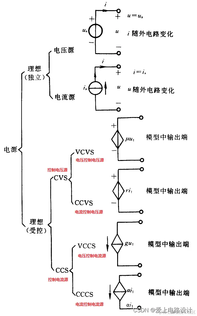 独立电源分为电压源与电流源,电源的参数有电压、电流、方向。电压源的性质是两端电压不变(内阻为零,比如电池,最好无内阻), 电压方向(极性)不变,电流及其方向由电压源与外电路共同决定。电流源的性质是输出电流不变(内阻无穷大), 电流方向不变,两端电压及其方向(极性)由电流源与外电路共同决定。