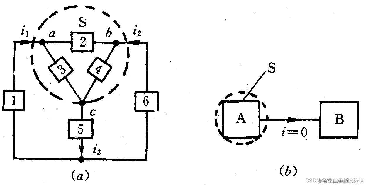 对闭曲面S,有i1+i2-i3=0A。若两部分电路只有一根线相连 (1或5或6其中一个) ,由KCL可知,该支路中无电流。如图(b)所示电路,作闭曲面S,因只有一条支路穿出S面。根据KCL, 由于i1、i2、i3只能有一个且i1+i2-i3=0A,故i=0。