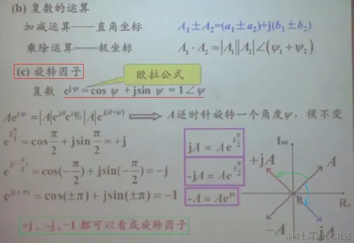 在二维平面上的一个相量,乘以j逆时针旋转90°,除以j或乘以-j顺时针旋转90°;乘以-1正时针或逆时针旋转180°。