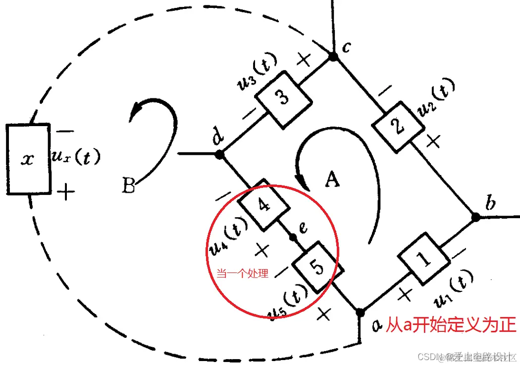 从a开始定义为正,U1与U5的下方为正(如图),此时U4要一并处理,U4下方为正。那么: