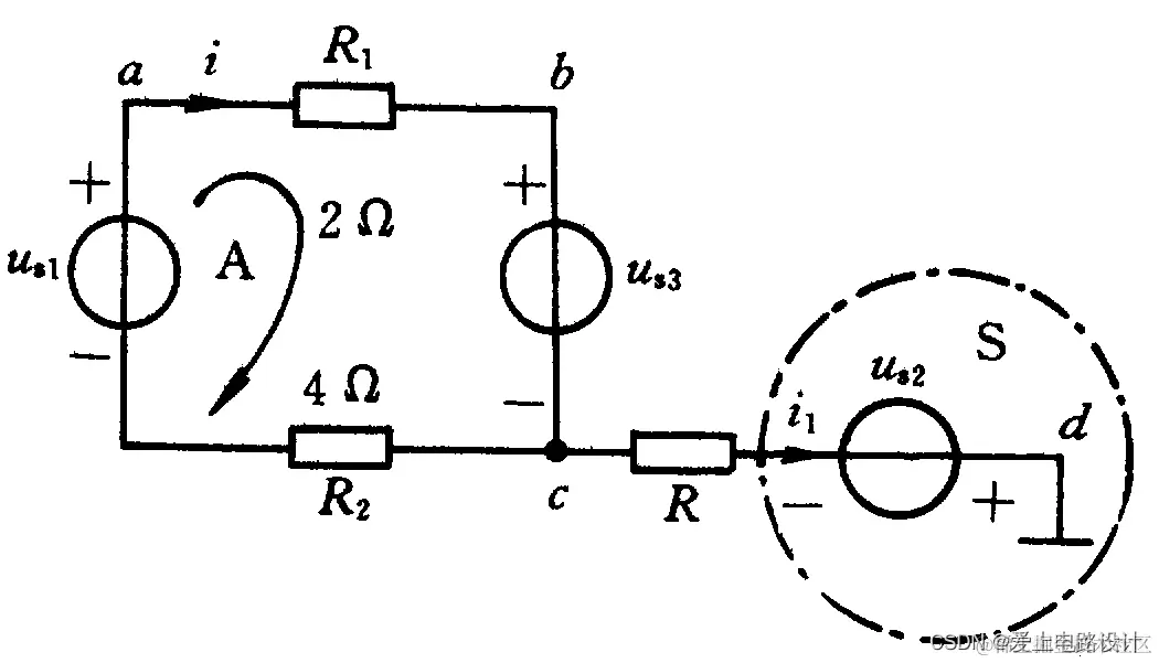 本题d点为参考点,由KCL可知i1=0, 所以回路A各元件上流经的是同一个电流i, 由KVL列写方程R1i+Us3+R2i-Us1=0V,代入己知的各电阻及理想电压源的数据,得i=1A;