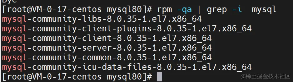 如果出现上面的文件,请使用yum remove mysql-xxx(上面查到的rpm包)依次删除,直到rpm -qa | grep -i mysql查询为空。