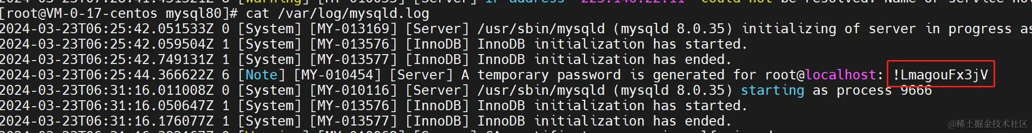 执行完初始化命令后,会为root用户生成一个临时密码并保存在日志中,可以使用cat /var/log/mysqld.log查看密码,后面登录需要使用该密码