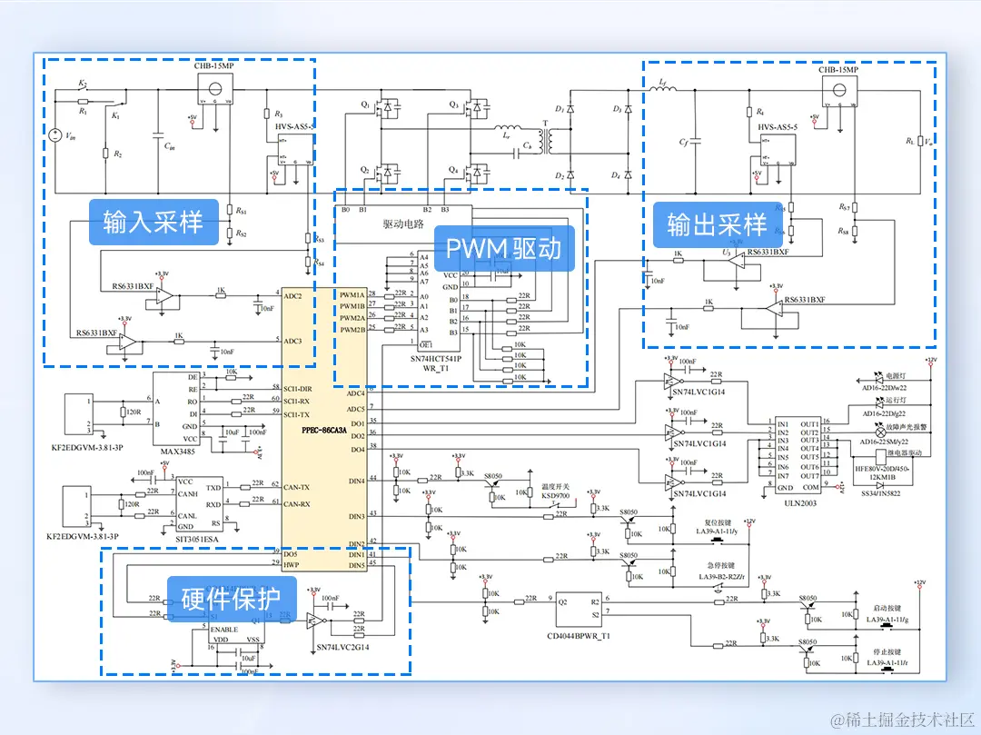 这里给出了PPEC-86CA3A移相全桥数字电源控制芯片的采样、PWM驱动以及硬件保护等外围电路设计图,大家可参考下图进行外围电路搭建与连接。