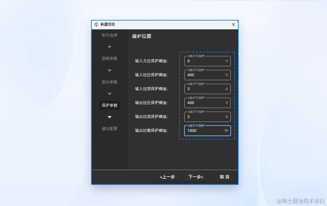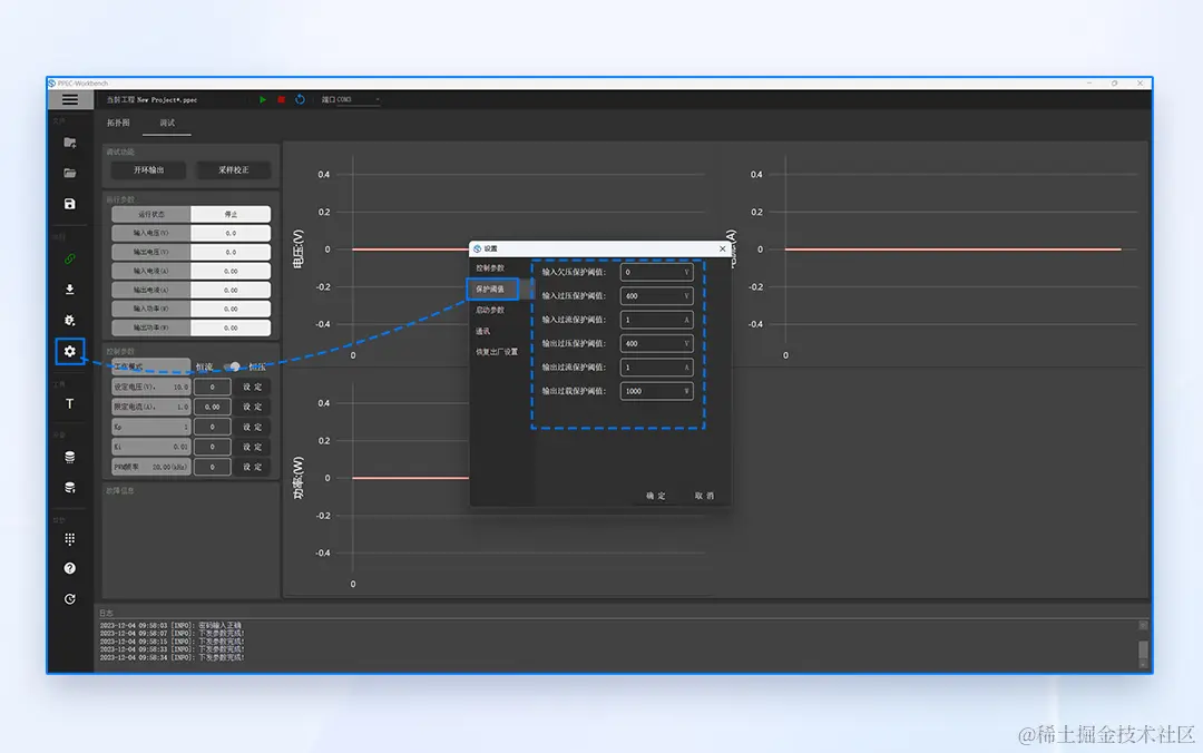 设置输入欠压、输入过压、输入过流、输出过压、输出过流、输出过载的保护阈值,可参考下图进行设置。当检测到某一参数超过设定的保护阈值时,电源控制核心会停止PWM输出,同时PPEC Workbench故障信息栏会显示具体的故障信息。