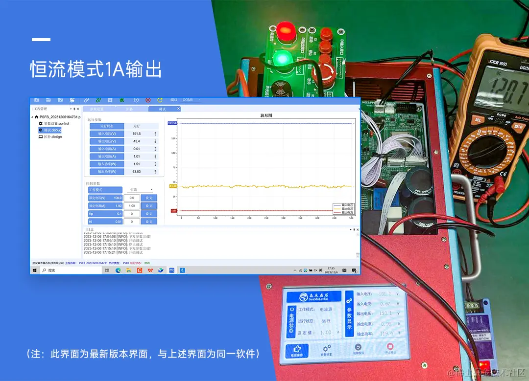 开环验证无误后,点击PPEC Workbench软件设备控制区的“运行”按钮,并利用万用表测量输出电压,如下图(a)所示:设定电压100V,闭环输出电压稳定在99.7V,闭环调试结果符合预期。同样的,可以按照上述步骤进行恒流电源的设计与调试,这里就不再赘述,输出1A的恒流源的闭环调试结果如下图(b)。