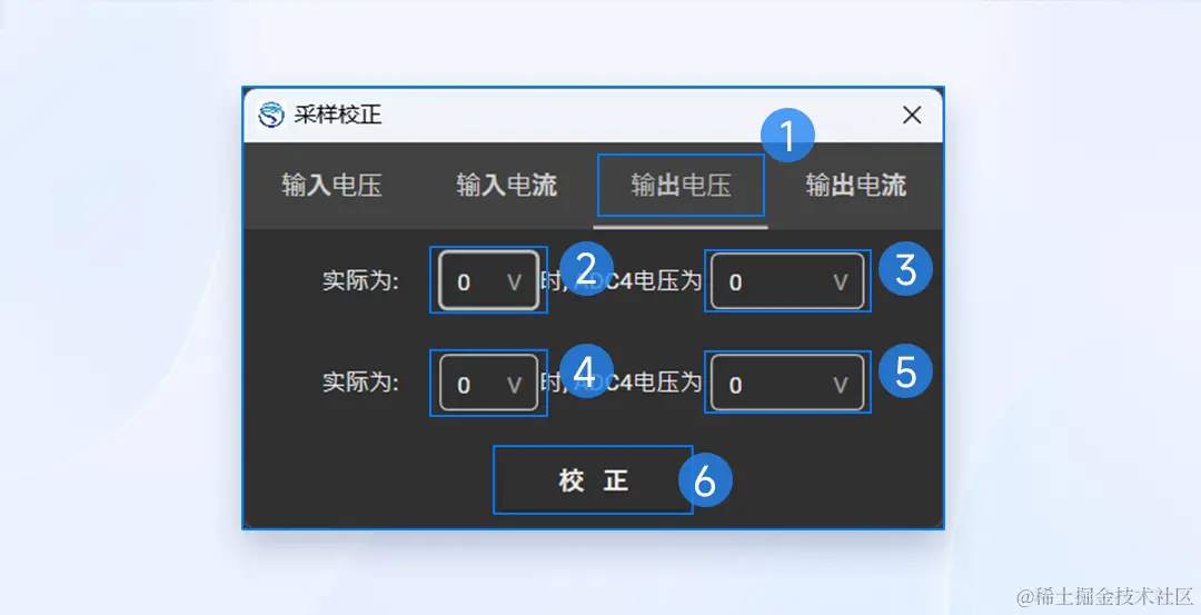 4)在①区切换到输出电压通道,在左侧(②、④)填入实际值,右侧(③、⑤)填入相应的采样值;