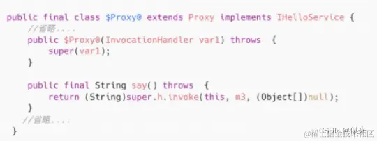 之所以要传入接口,不能传入类,还是取决于JDK动态代理的底层实现(如图)。JDK动态代理会在程序运行期间动态生成一个代理类$Proxy0,这个动态生成的代理类会继承java.lang.reflect.Proxy类,同时还会实现被代理类的接口IHelloService。