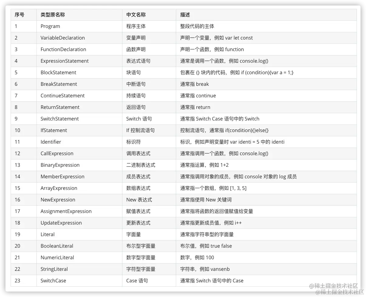 以树状形式表现编程语言的语法结构,树上的每个节点都表示源代码中的一种结构。JavaScript引擎工作工作的第一步就是将代码解析为AST,Babel、eslint、prettier等工具都基于AST。