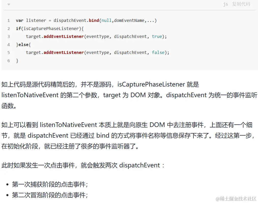 - 绑定事件并不是一次性绑定所有事件,比如发现了 onClick 事件,就会绑定 click 事件,比如发现 onChange 事件,会绑定