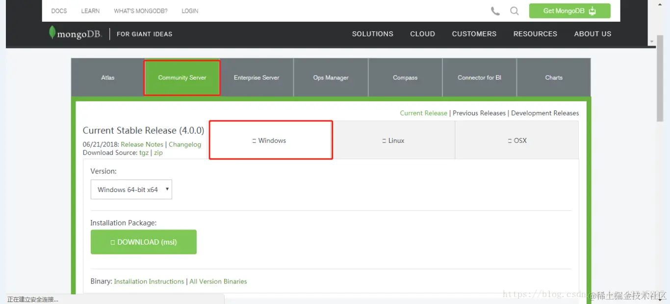 首先进入MongoDB的官网下载安装包进行安装www.mongodb.com/download-ce…。进入网页后,可根据自己电脑系统进行选择在Windows、Linux和OSX三种不同操作系统下的安装包。