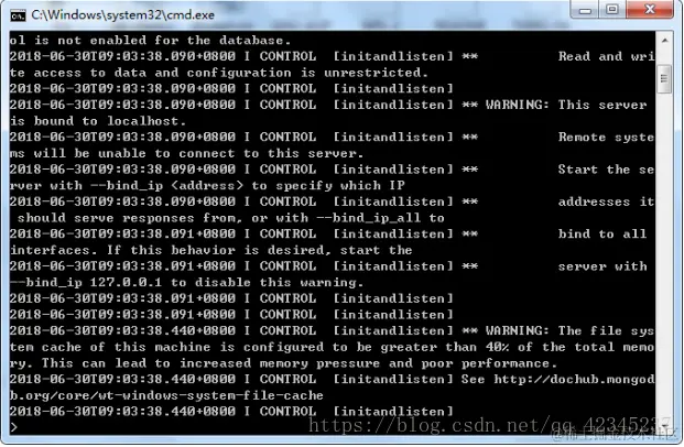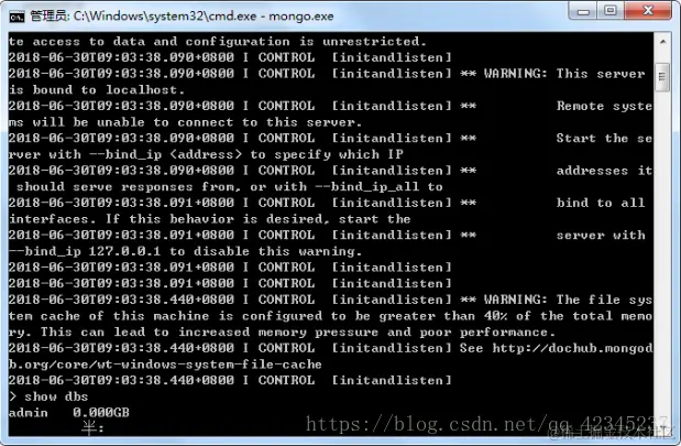 成功运行MongoDB以后,紧接着就是连接MongoDB了,同样的方法,在bin目录下打开命令行窗口,执行以下命令: