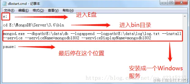 你的MongoDB安装在哪个盘第一行就写哪个盘,第二行cd进入bin目录,第三行输入mongo,exe,最后一行pause: 停在这个位置。
