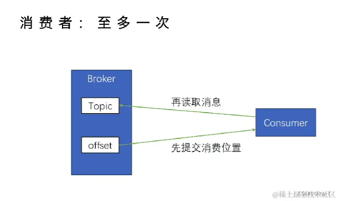 - 如果消费者在处理消息之前就提交偏移量至_consumer_offsets(一种特殊的Topic,存放每个Consumer的消费位置),然后消费消息,则属于最多一次(自动提交【下文会讲】可能会导致这种情况)。如果在处理消息之后发生故障,那些消息可能不会被重新消费。