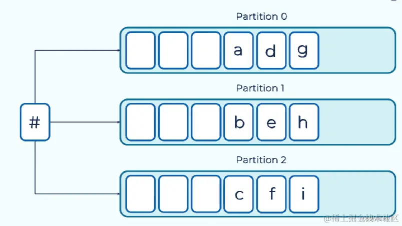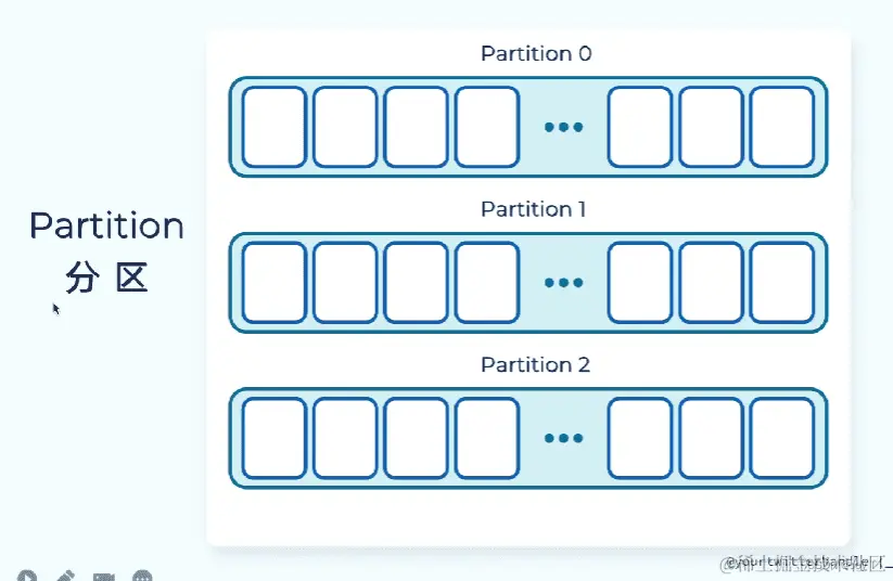 - 主题可以包含多个分区(分布式的消息系统),不同的分区存储在不同的服务器上,并且存在三副本(分区Partition)备份原则,而且是与硬盘直接打交道的(replication-factor=3)。