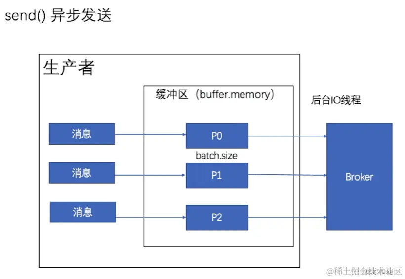 - 即使是在 acks=1 或 acks=all 的设置下,生产者的消息发送操作仍然是异步的。生产者将消息放入对应分区的本地缓冲区,然后由后台的 I/O 线程负责将消息批量发送到 Kafka 服务器(Broker)。这种异步发送机制有利于提高生产者的吞吐量和效率。