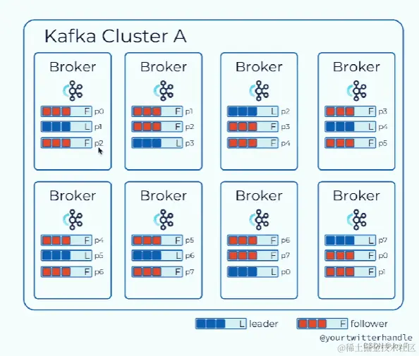 例子:八个Broker服务器,共有八种分区,每个分区都有三个备份。