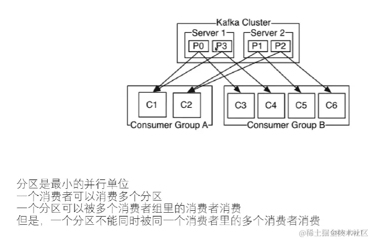 最后一句话少了个“组”。首先记忆消费者和分区是多对多的关系,然后只要多记住一个限制:同一个组的消费者不能同时消费一个分区(出于性能和开销的考虑,会额外引入锁这样的机制)。