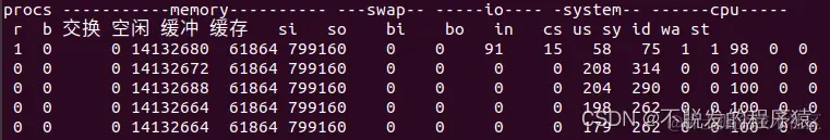 使用方法:在终端输入 vmstat 1,其中 1 是指定每秒更新一次信息。