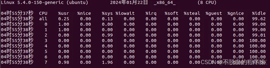 使用方法:在终端输入 mpstat -P ALL 1,其中 -P ALL 表示显示所有CPU的信息,1 表示每秒更新一次。