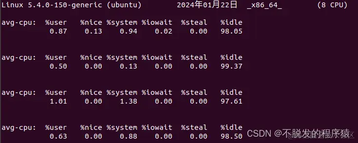 使用方法:在终端输入 iostat -c 1,其中 -c 表示显示CPU使用情况,1 表示每秒更新一次。