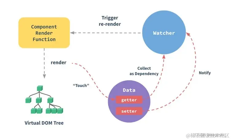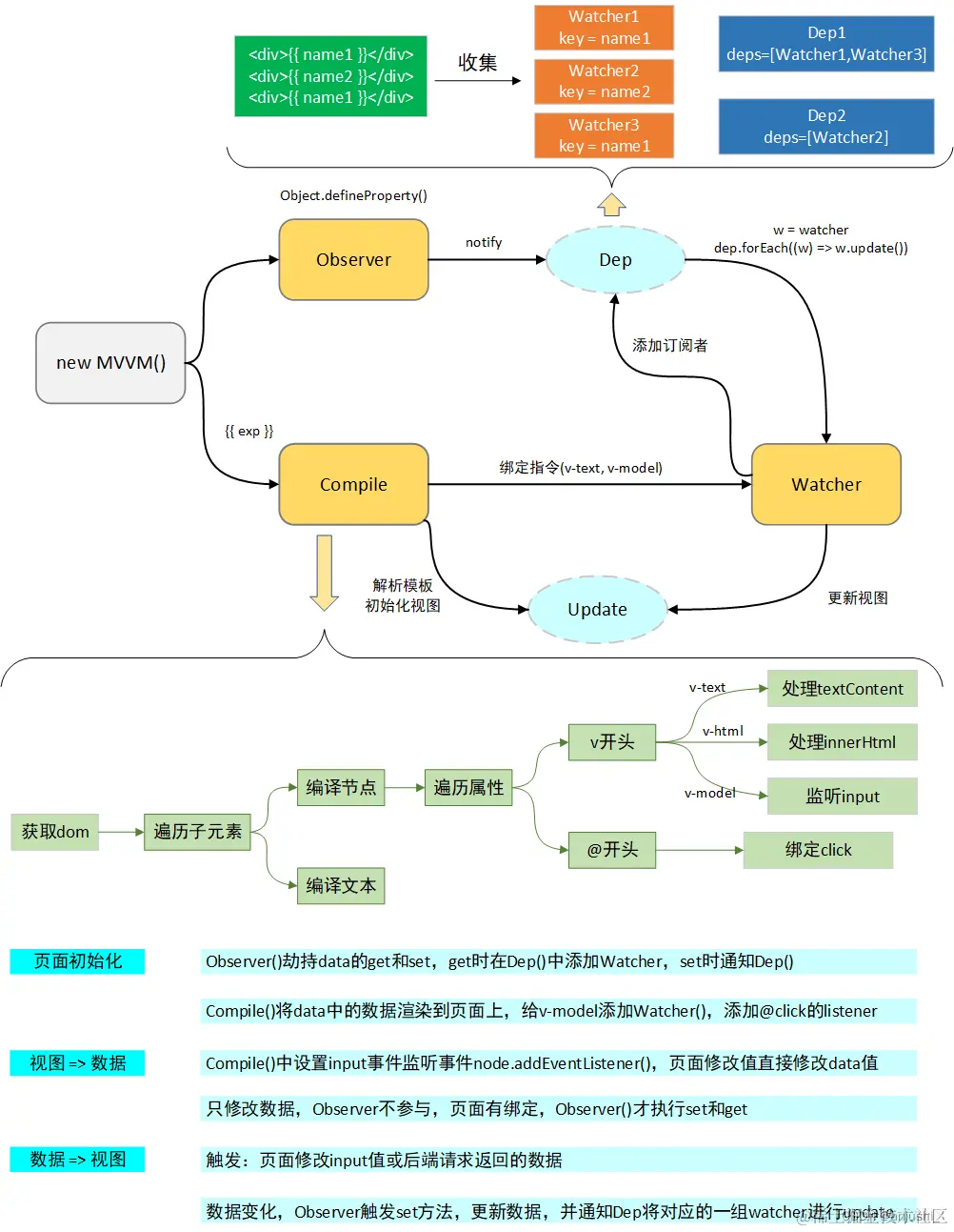 - 当后端传来新数据或者数据发生变化时,Observer 会执行 setter 方法,通知 Dep 更新视图。