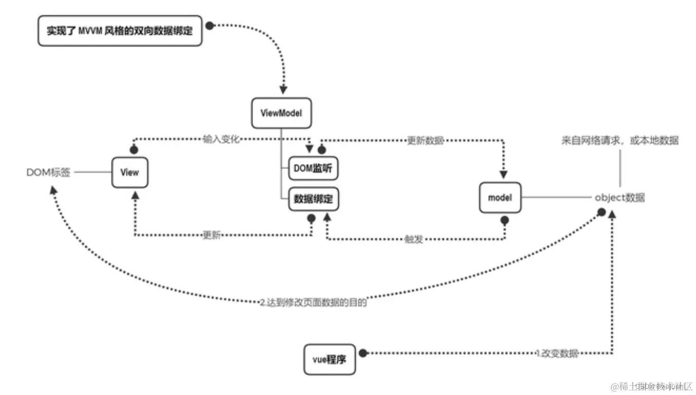 MVVM是Model-View-ViewModel的简写,即模型-视图-视图模型,MVVM是双向、自动的,也就是数据发生变化自动同步视图,视图发生变化自动同步数据。