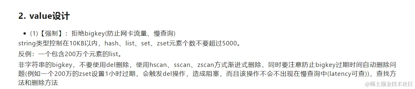 - 数据结构设计不合理。在不适用的场景下使用Redis,易造成Key的value过大,如使用String类型的Key存放大体积二进制文件型数据;