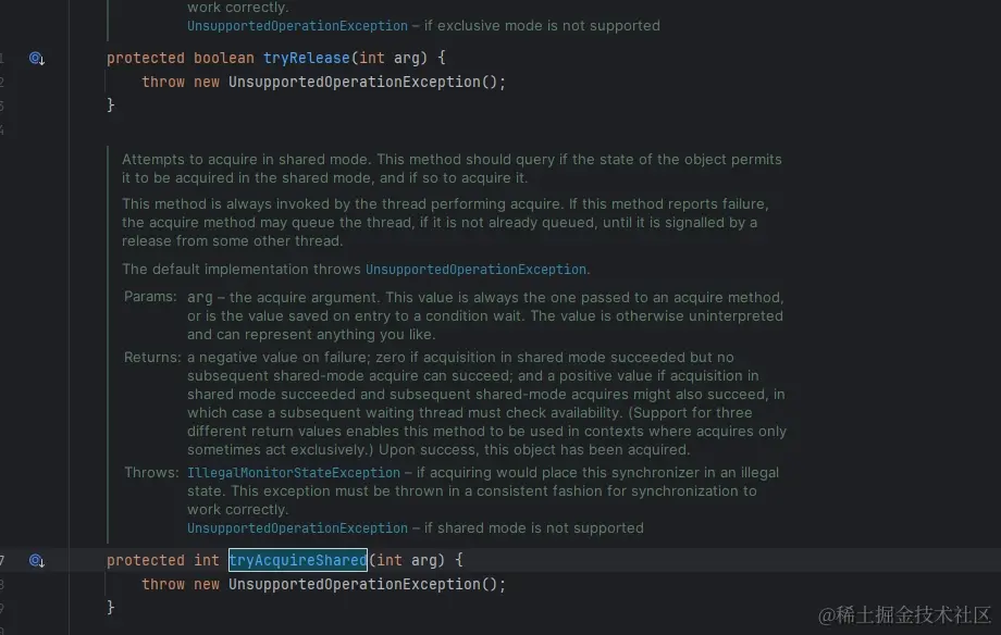 打开AQS的源码,我们可以看到tryAcquireShared和tryAcquire这两个方法都是没有具体实现的,这里其实就是模板方法设计模式的体现