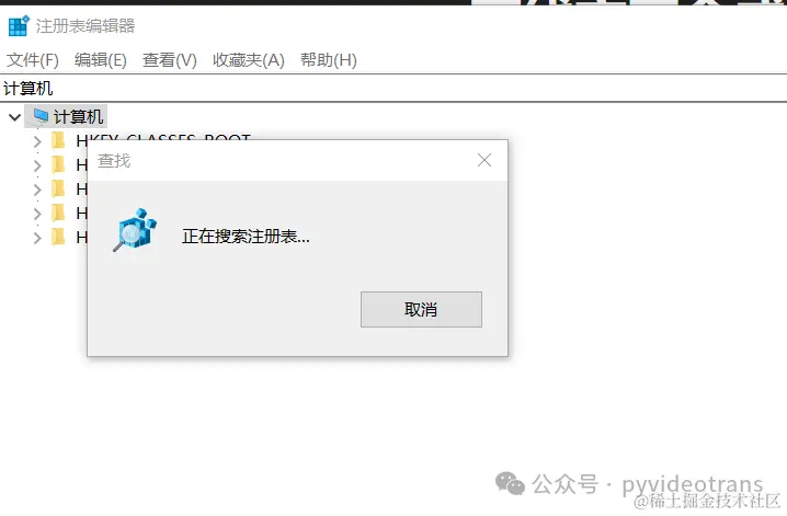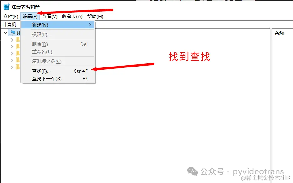 依次点击注册表窗口顶部的菜单-“编辑(E)”-查找(F)... 将自动弹出搜索窗口