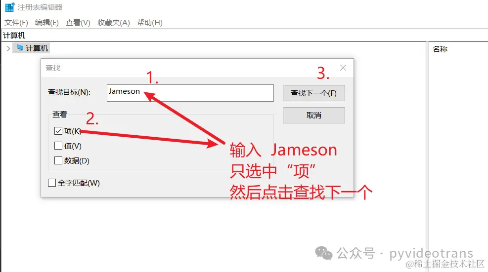 搜索窗口如下图,在弹出的窗口中,只保留 “项(K)”选中,取消其他的选中,然后在 “查找目标(N)” 中输入单词“Jameson”,点击查找下一个。