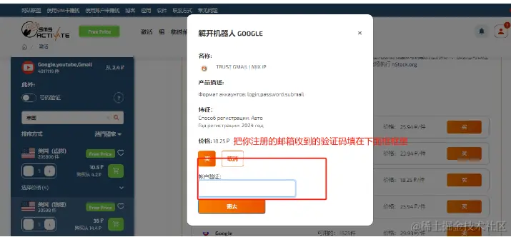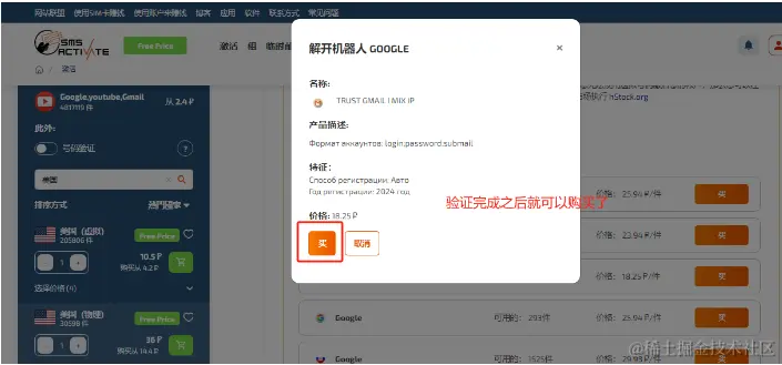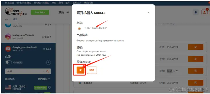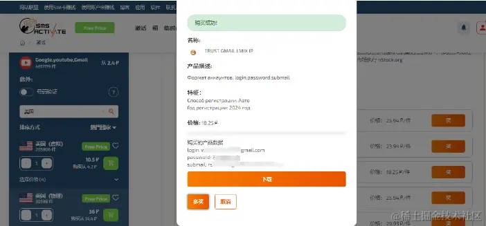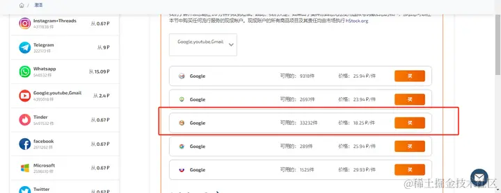 5、开始购买现成账号,点击首页面的[激活],可以看到有个购买现成账号的栏,点击进去之后,就可以选择我们今天的主角服务(Google、Gmail、YouTube),(选了一个18.25卢币的,约等于人民币1.4)如下图所示