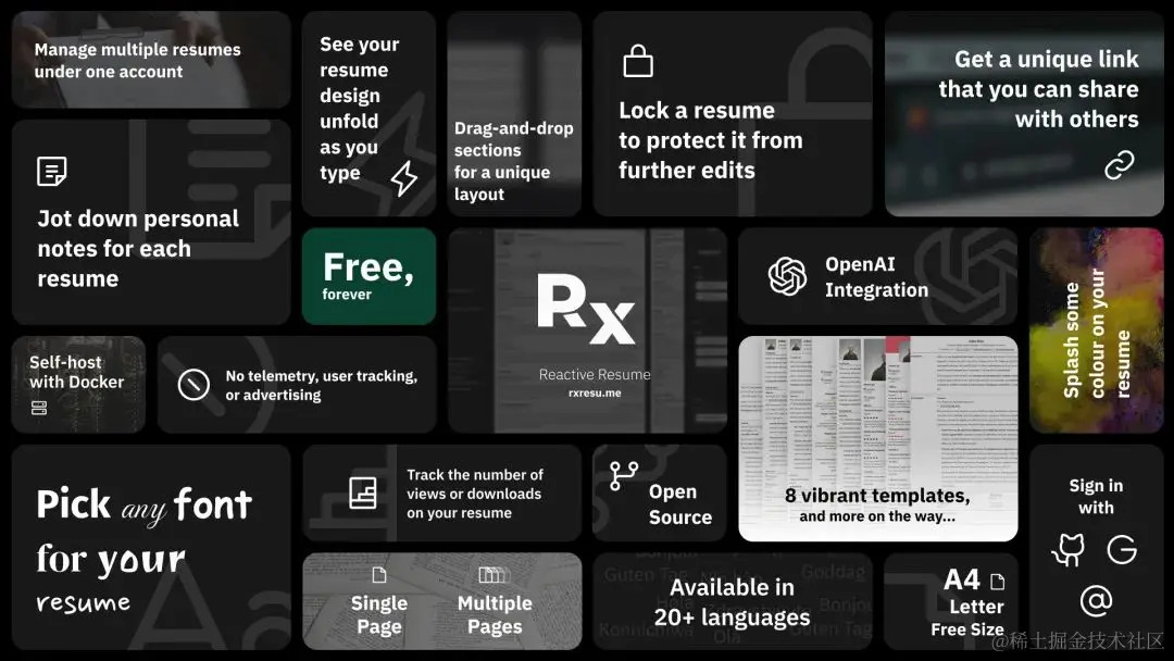 “Reactive Resume”提供丰富的功能,如免费使用、支持多种语言、支持自行托管、用户账号创建灵活性(支持电子邮件地址、GitHub或Google账号登录,并支持双因素认证)。它还允许用户根据不同的工作申请优化简历,以获得更高的ATS(应用跟踪系统)评分。