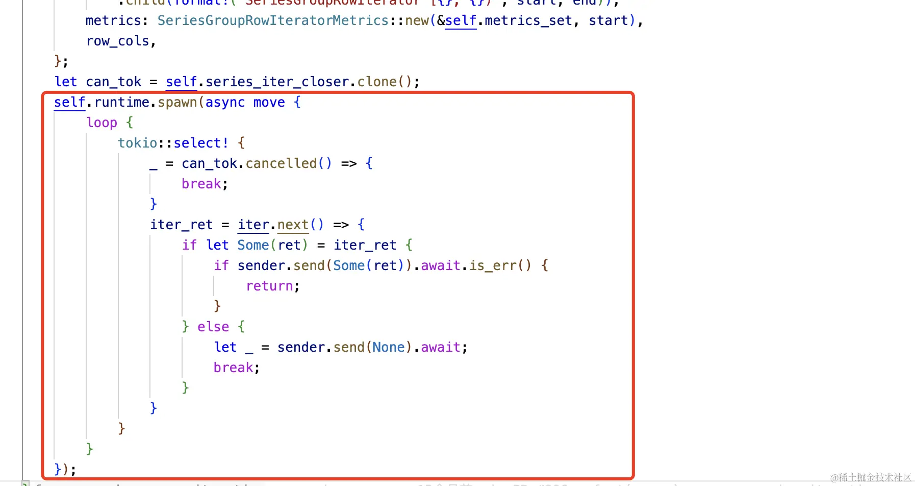 虽然,通过工具发现了内存释放后继续使用的问题;但是,一时并没明白这块内存到底是怎么被释放的;最终,把怀疑的目光放到了CancellationToken这一块,然后通过测试确认了这一点。下面是具体使用之处,series_iter_closer是一个CancellationToken类型的变量,iter.next()会最终调用上面的pread()方法。