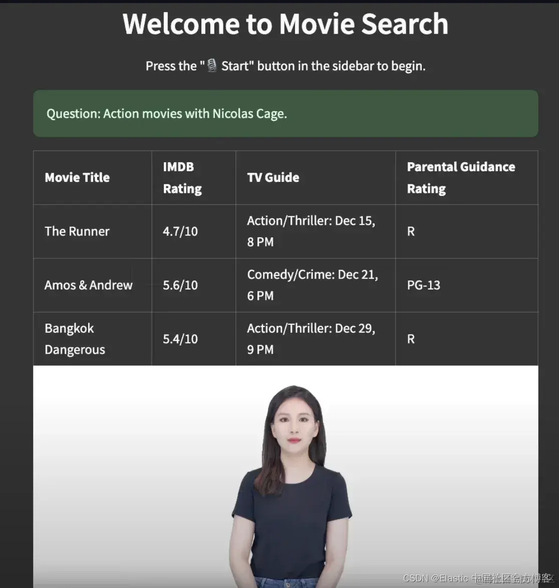 高级搜索体验始于用户语音交互,这些交互通过 Azure Speech to Text 转换为文本,形成搜索查询的基础。 然后,使用 ELSER 通过 Elasticsearch 处理该查询,以检索相关文档,例如列出 “action movies featuring Nicolas Cage - 尼古拉斯·凯奇主演的动作电影” 的电视指南。 这确保了搜索结果的准确性和相关性。
