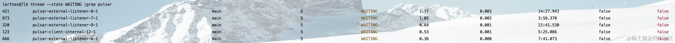 此时就会列出当前 Java 进程中状态为 WATING 并且线程名称以 pulsar 开头的线程。