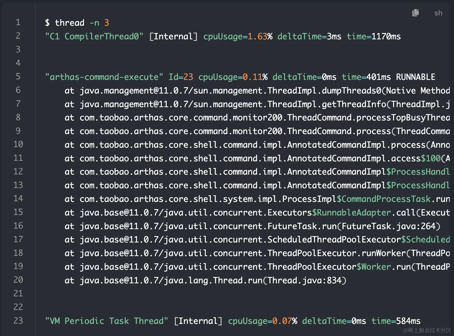 使用以上命令就可以将 cpu 排名前三的线程打印出来,并且列出他的堆栈情况,这样可以很直观的得知 cpu 消耗了在哪些地方了。