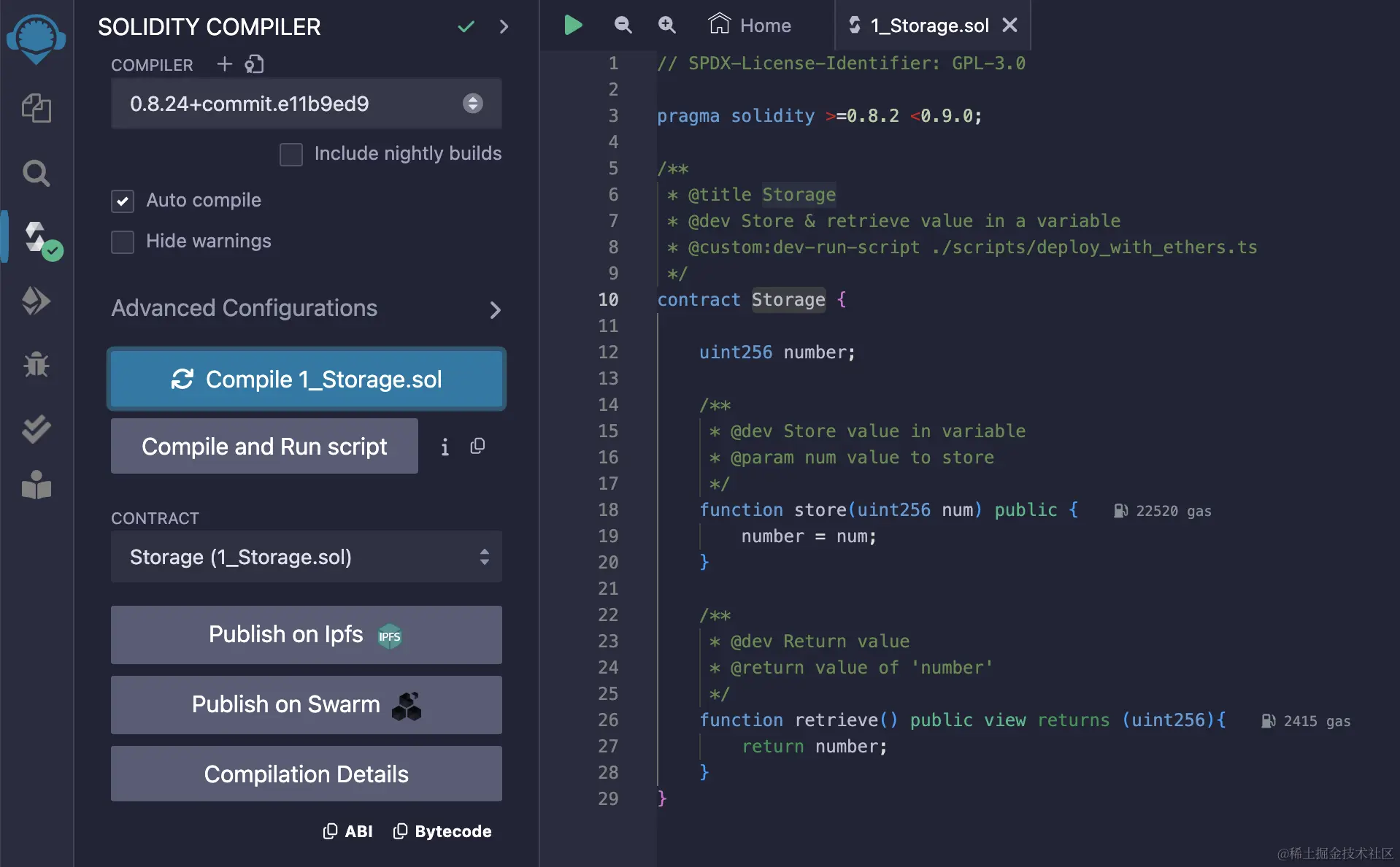 (此处以Remix IDE自带的Storage.sol智能合约为例,也可以新建自己的自定义xxx.sol)