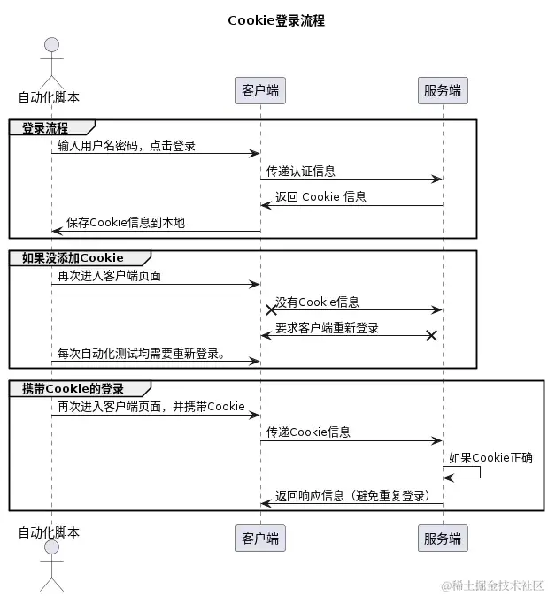 在进行自动化测试时,通常需要登录网站进行操作。复用浏览器仍然在每次用例开始都需要人为介入,只要关闭浏览器后就需要在重新人为介入。会导致测试效率将非常低下,甚至无法进行大规模的测试。使用 Cookie 自动化登录可以很好地解决这个问题。
