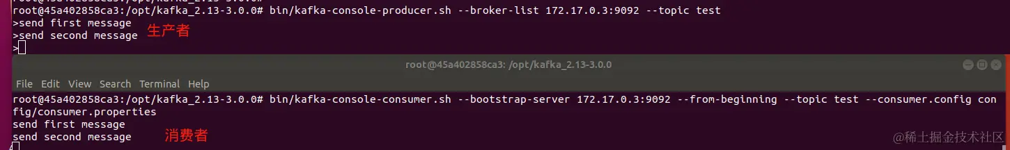 bin/kafka-console-consumer.sh --bootstrap-server 172.17.0.3:9092 --from-beginning --topic test --consumer.config config/consumer.properties