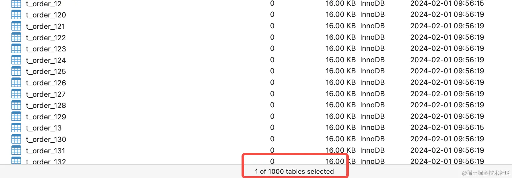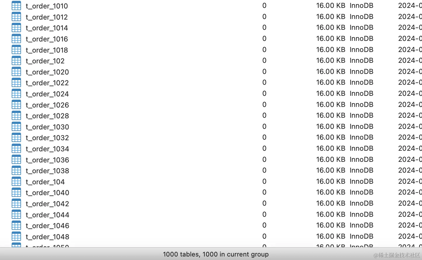 还是执行刚才创建表的单元测试,会发现db0、db1两个实例中已经各自创建了1000张分片表,但你会发现1000张表已经不再是按照顺序创建的了。