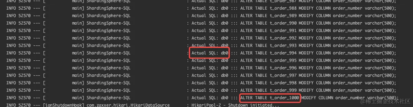通过查看两个分片库,我们成功地将所有分片表的order_number字段长度更改为了varchar(500),在控制台日志中,可以看到它是通过在每个分片库内依次执行了1000次命令实现的。