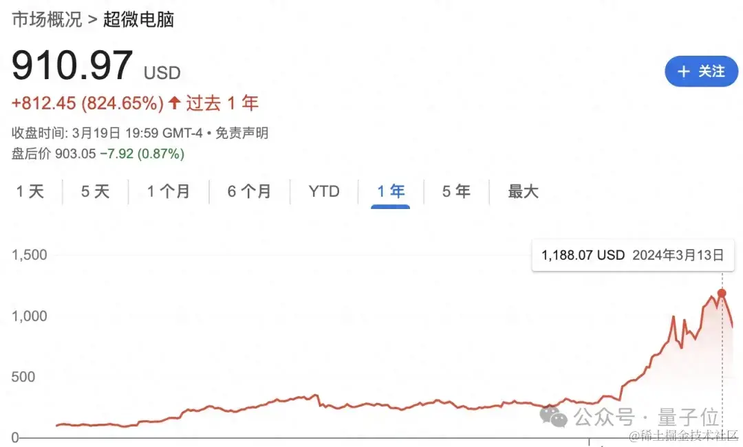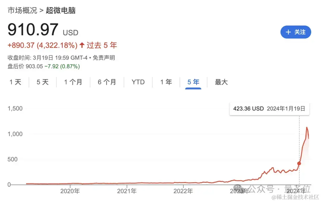 时间拨到更早一点,2023 年 3 月底的超微电脑,则 “不过” 大约 100 美元,等于一年时间就涨了 9 倍。