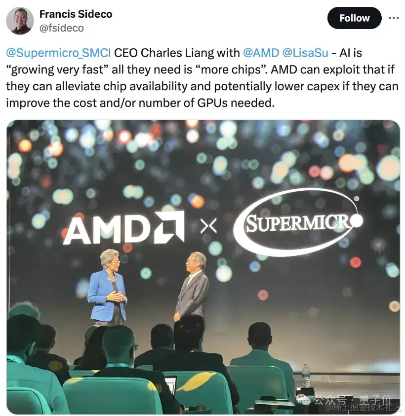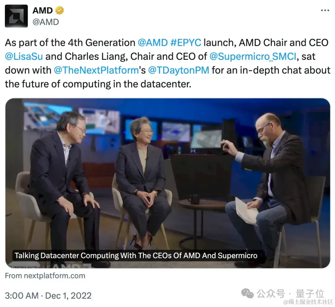 去年 12 月,AMD 发布对标 H100 的 GPU“Instinct MI300X GPU” 时,苏妈就找来梁见后一起大谈数据中心未来。