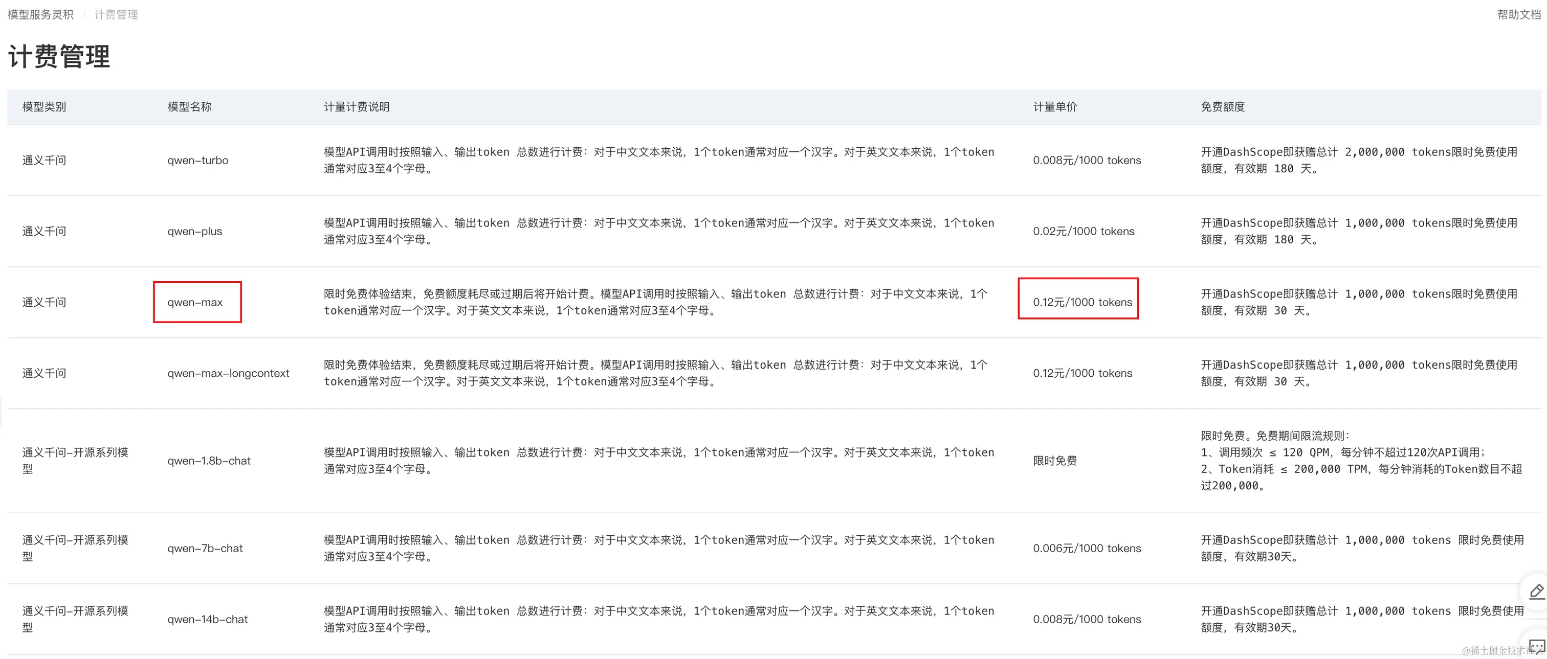为什么选择阿里云的通义大模型呢?因为在此之前是免费的,然而,最近开始收费了。是的,价格还是蛮贵的,看了下我之前调用的模型是qwen-max,都收费到了0.12元/1000 tokens。这个收费是什么概念呢,我统计了下,我每天用这个API回答5个问题, 我最近20天回答了100个问题,就用了大概 1000 * 1000 tokens,还好在免费额度里,算了下账,都差点要120元了😭.