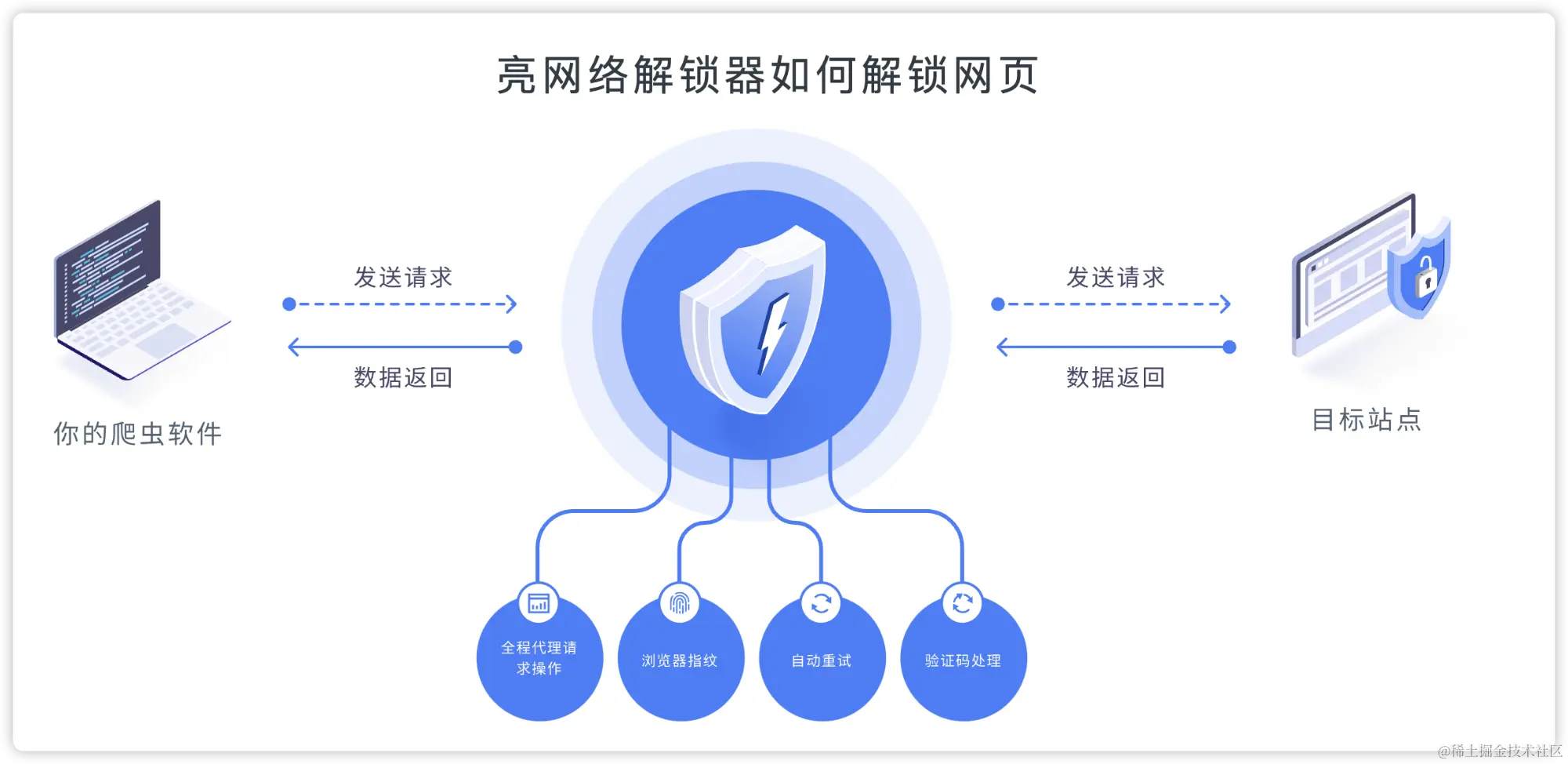 利用亮数据的强大动态住宅 IP 网络,自动解锁网站屏蔽,包括解决验证码的阻止和限制、自动 IP 轮动、识别并绕开蜜罐陷阱、自动重试和指纹管理。