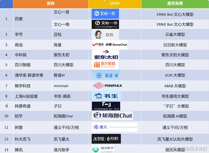基本上中国的头部企业都在里面。文心一言、文心一格、字节、知乎、腾讯混元助手 、通义千问、通义万相、讯飞星火等。