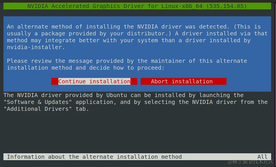 在Ubuntu的Software & Updates中选择需要安装的显卡驱动安装即可。安装完成后执行指令nvidia-smi