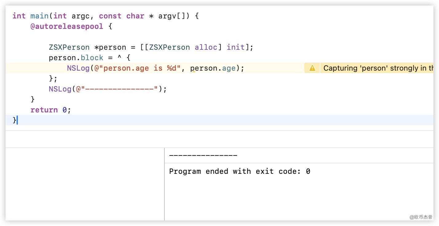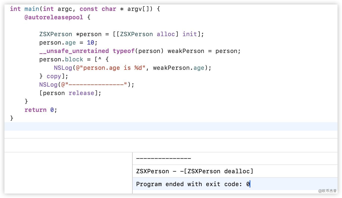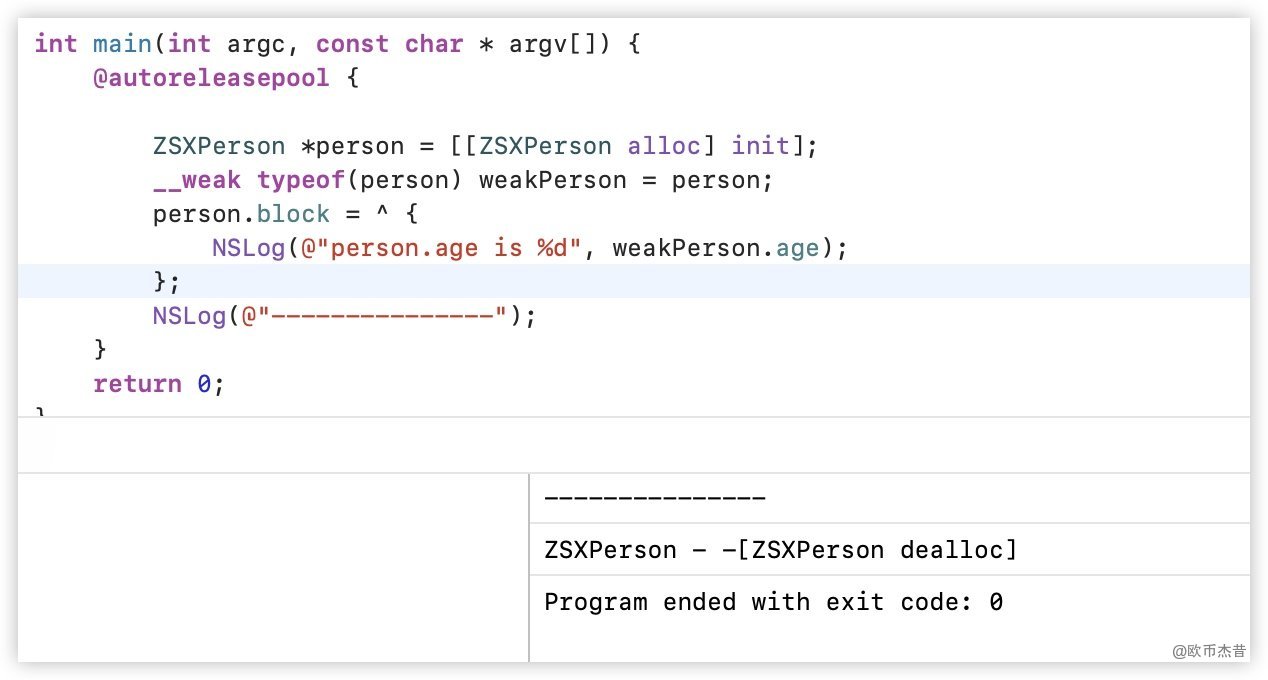 ZSXperson对象person,然后将block赋值给person的block,此时person是强引用block - 在
