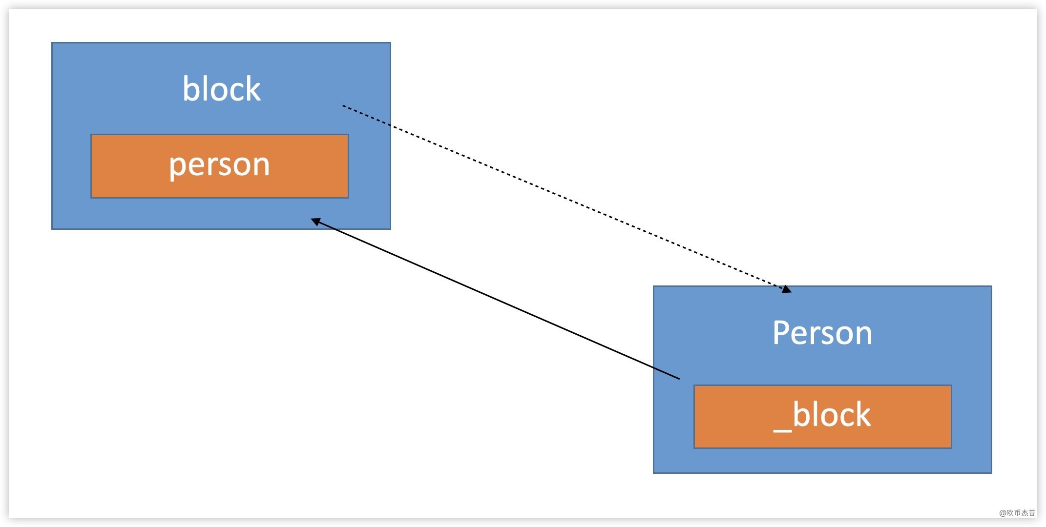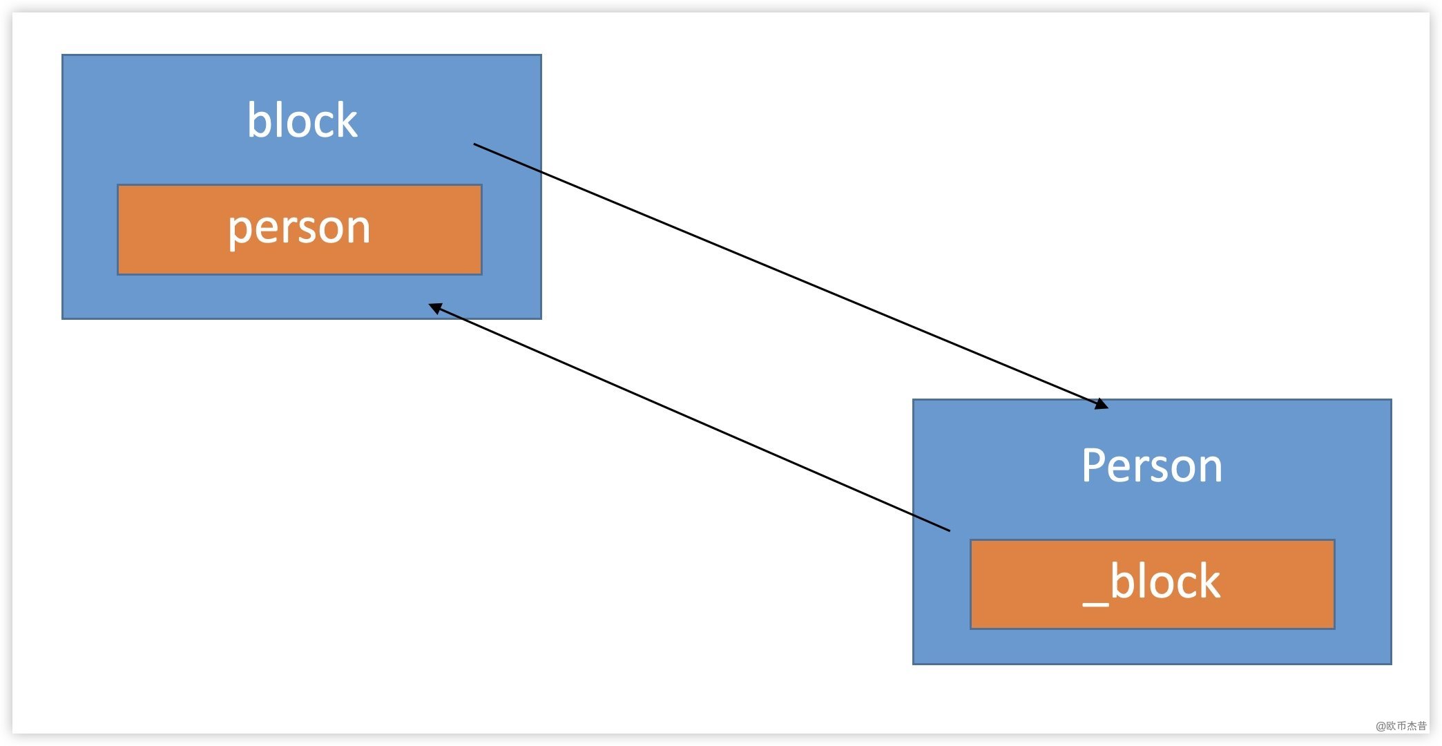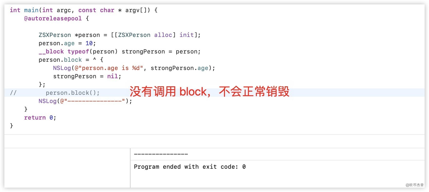 ZSXperson对象person,然后将block赋值给person的block,此时person是强引用block - 在